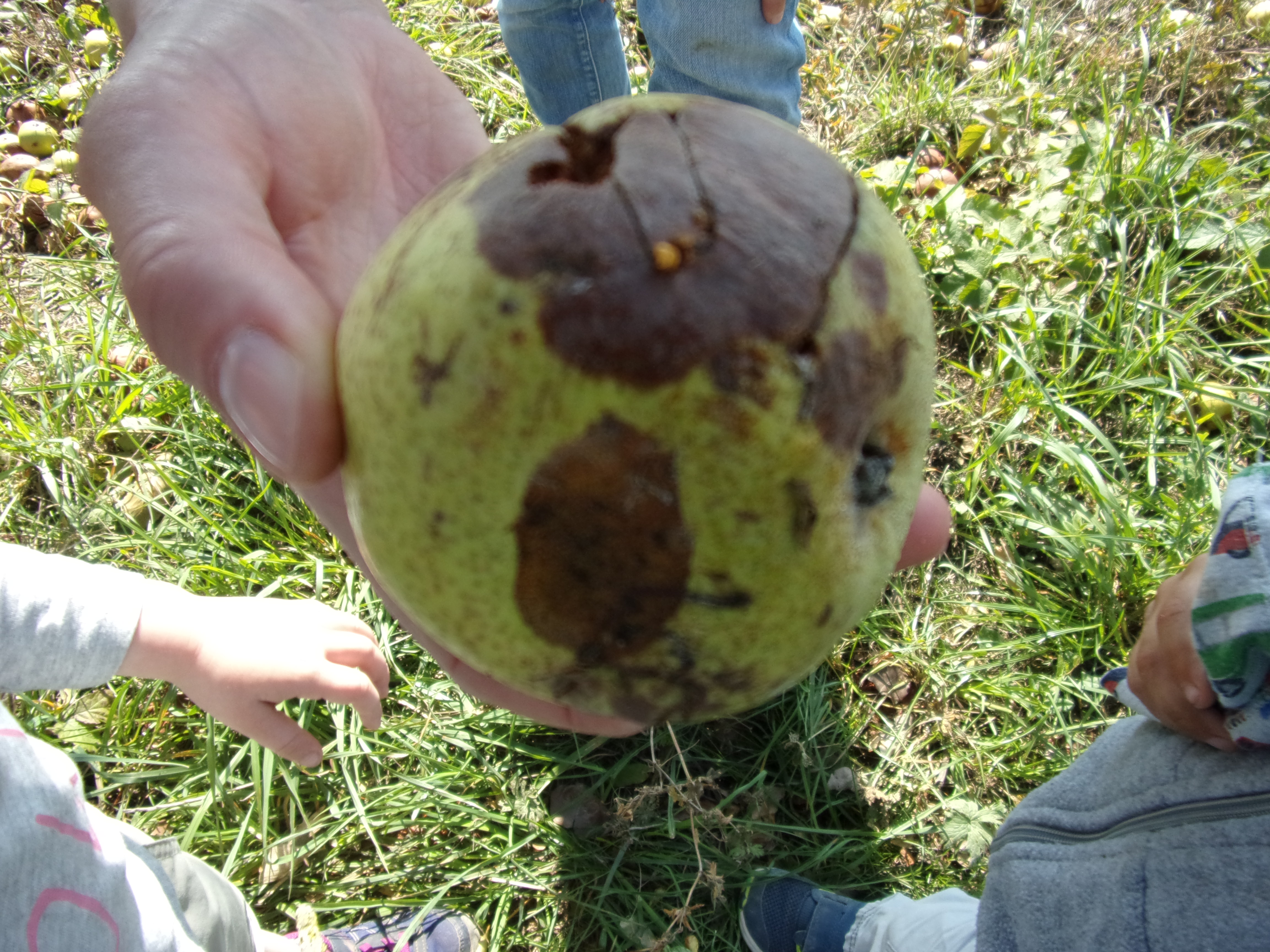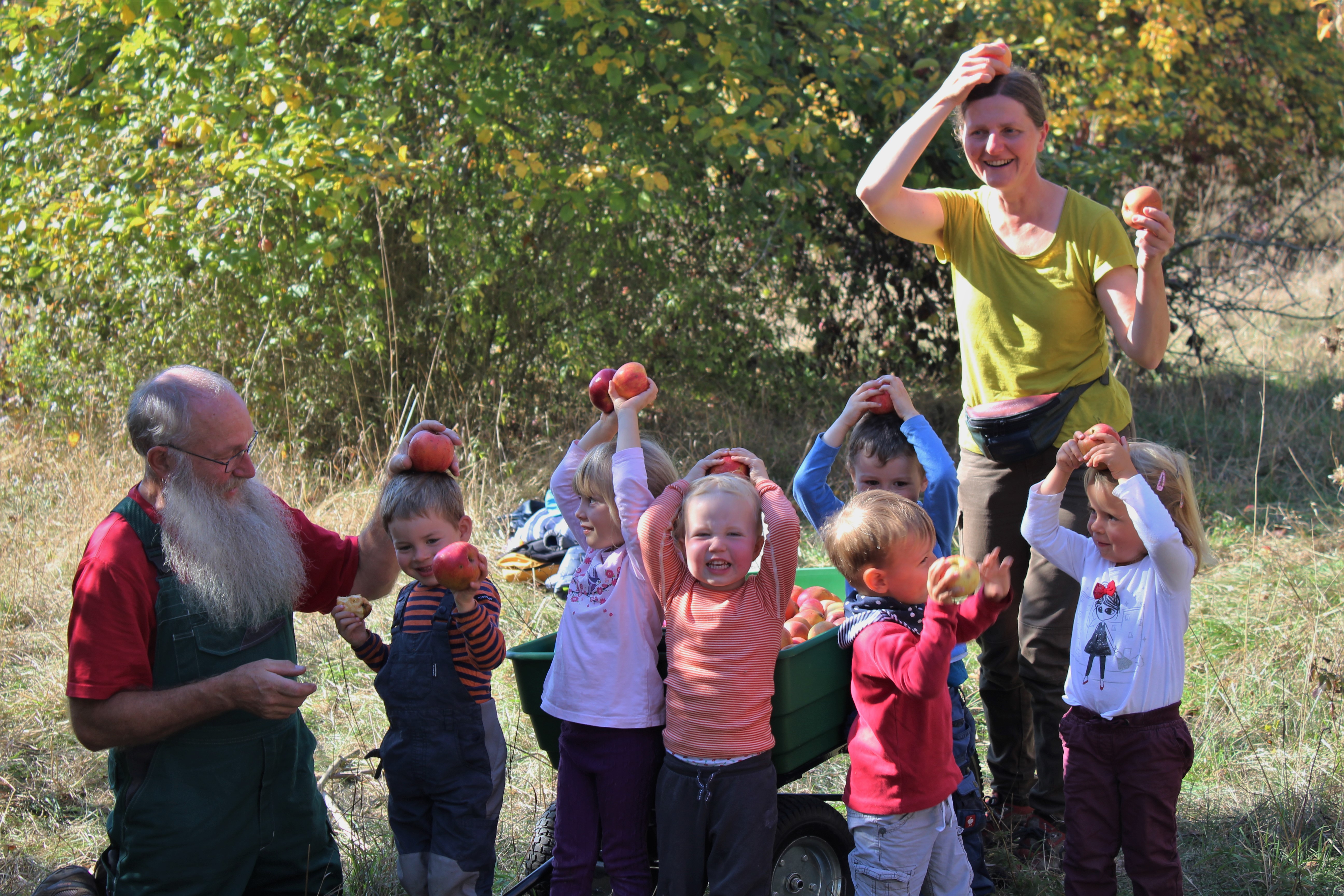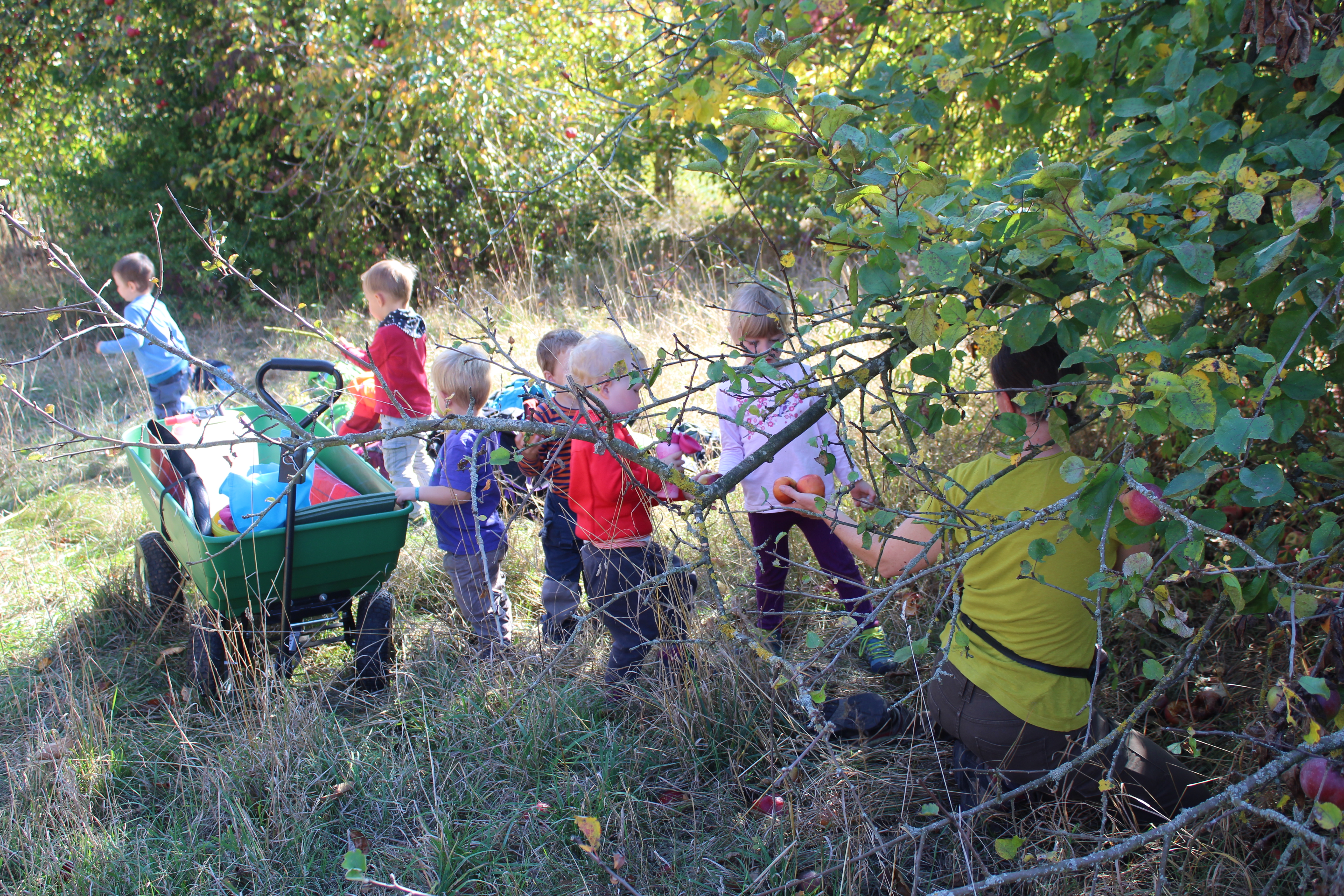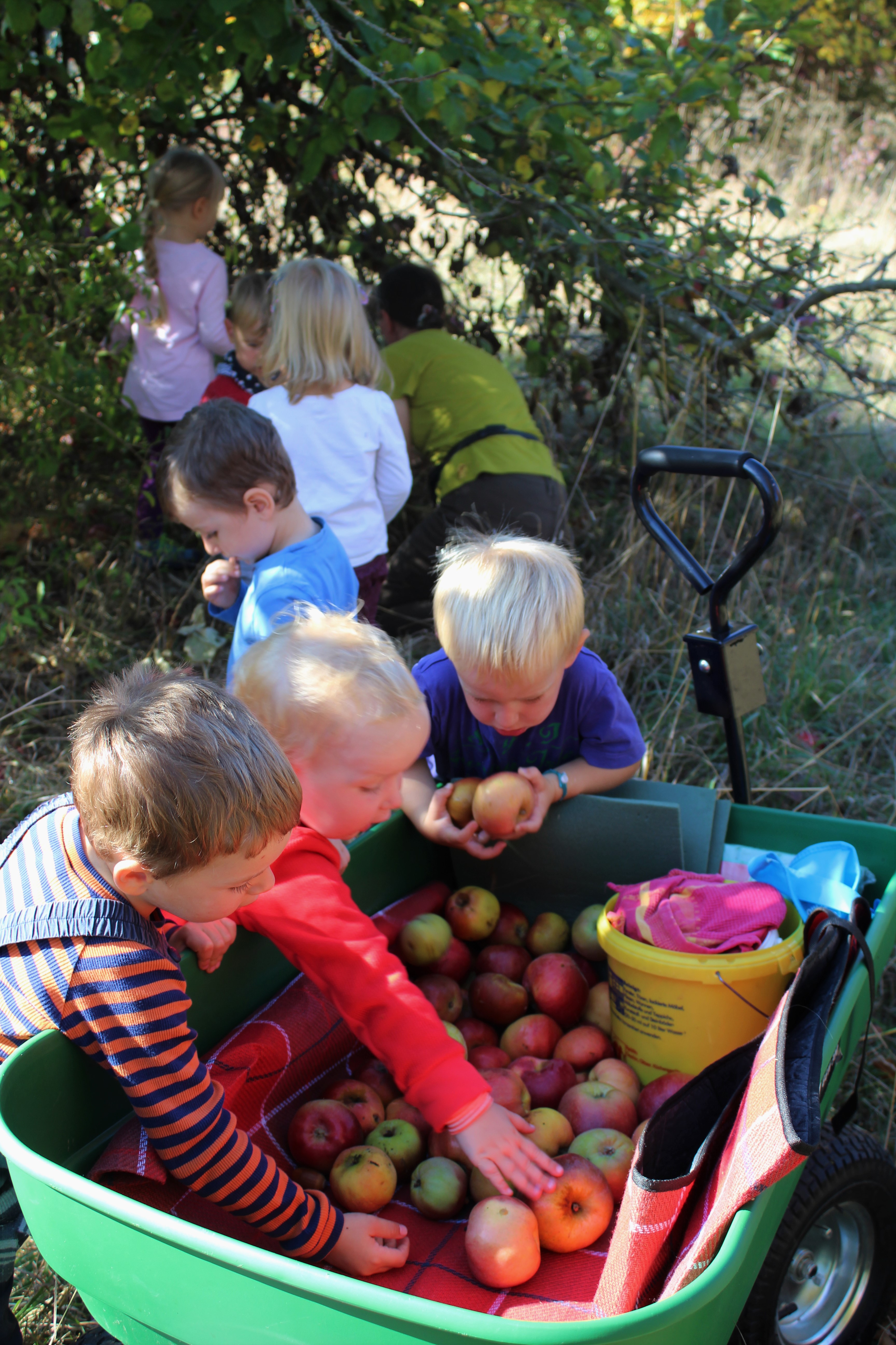 An einem schönen Herbsttag wanderten wir mit den Kindern zur Streuobstwiese bei der Quelle. Dort fanden wir überall Äpfel unter den Bäumen. Die Guten sammelten wir in den Bollerwagen, bis er ganz voll war.