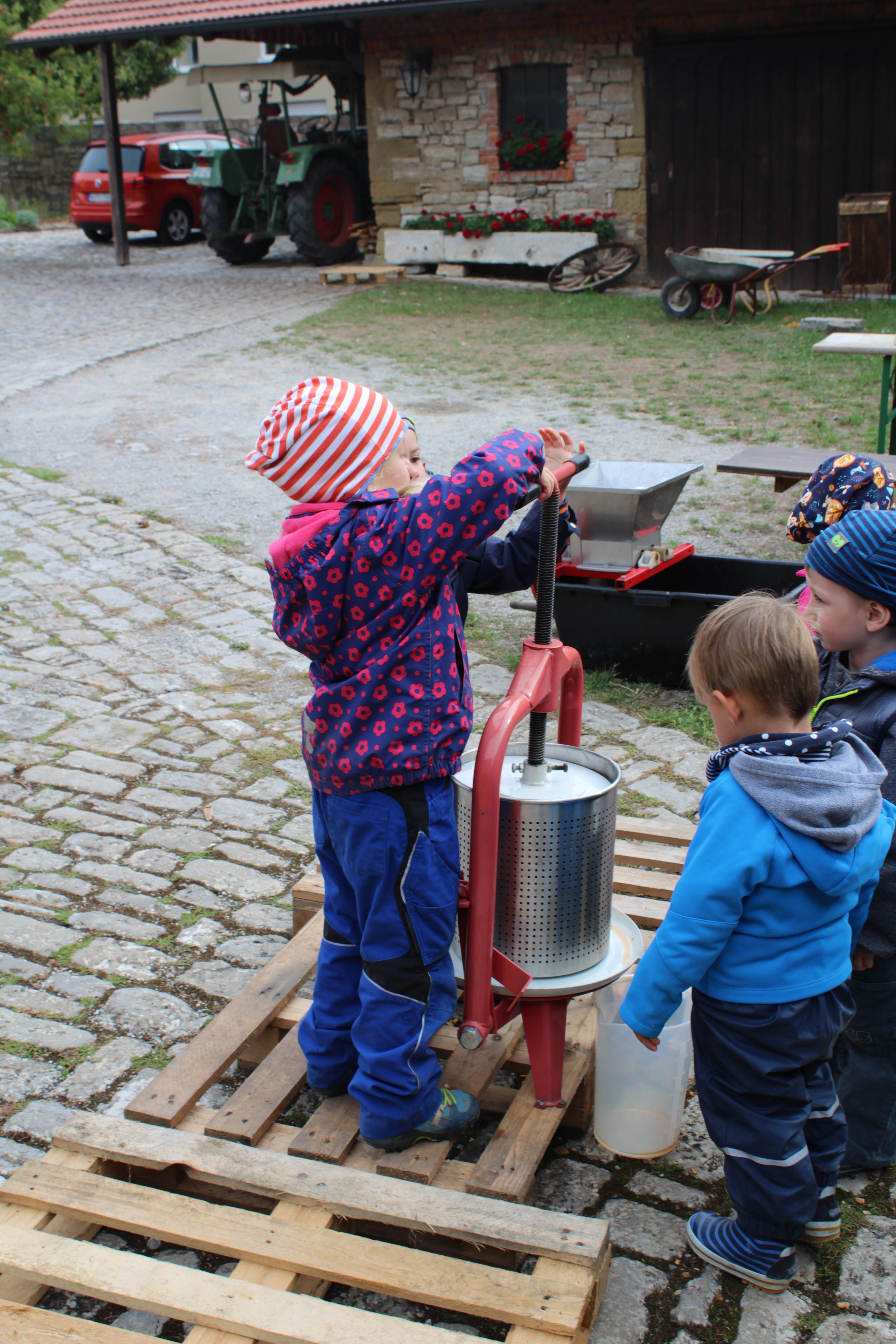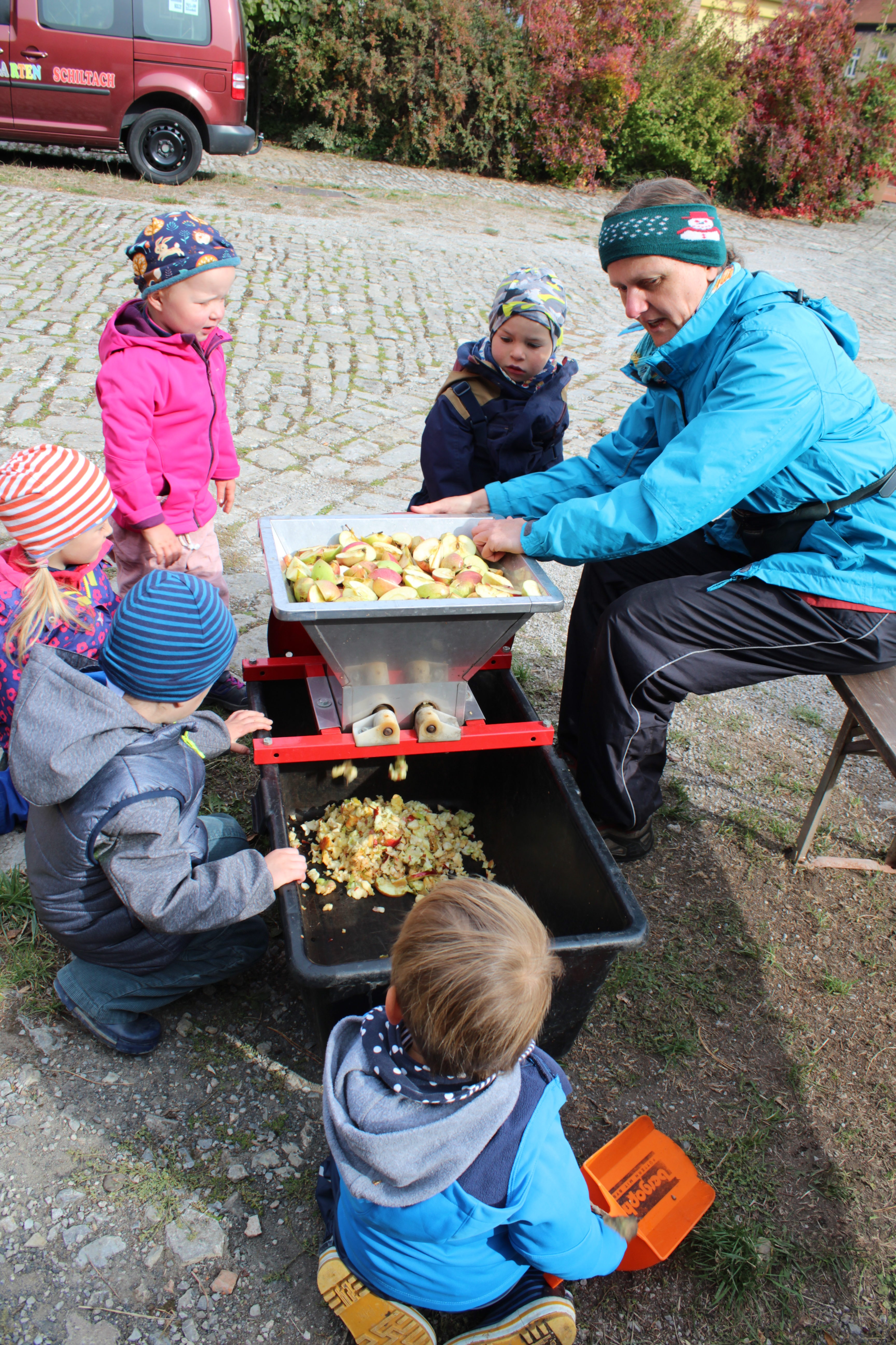 Natürlich probierten wir alle Varianten der Apfelverarbeitung aus: Wir haben sie gewaschen, geschnitten, geschält, geraspelt, gepresst und gebacken. Ob beim Saft pressen, beim kalt gerührten Apfelmus, fürs Trocknen der Apfelringe oder fürs Apfelküchle backen: Äpfel sind einfach lecker!
