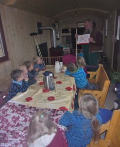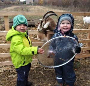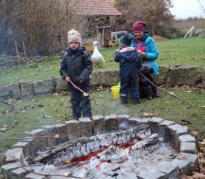 Zwei Nikolauslieder sangen und übten wir am Freitag im Morgenkreis, weil es ja bald soweit ist, dass wir uns an den Bischof Nikolaus erinnern: der 6. Dezember 343 n. Chr. ist der Todestag des Bischofs. Beim Singen üben konnten wir natürlich unsere neuen Musikinstrumente ausprobieren: Rasseln, Schellen, Klanghölzer, eine Triangel und ein Xylofon. Nachdem die Tiere und wir gevespert hatten, entzündeten wir an der Feuerstelle und im Ofen des Bauwagens ein Feuer. Auch das will gelernt sein. Am Lagerfeuer wollten wir die geernteten Kartoffeln und Möhren garen, also legten wir sie in die Glut. Weil wir nicht recht wussten, ob und wie gut das funktioniert, haben wir zusätzlich auf dem Ofen Kartoffeln, Möhren und rote Beete im Kartoffeldämpfer gegart. Die wurden schön gar und schmeckten mit Kräuterquark vorzüglich. Mit dem Gemüse aus dem Lagerfeuer hatten wir leider keinen Erfolg, denn das war außen schwarz und innen hart. So lernen wir im Natur- und Bauernhofkindergarten auf dem Pabst-Hof immer wieder etwas dazu. Das Gute ist, dass wir, Jung und Alt, gemeinsam lernen.