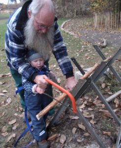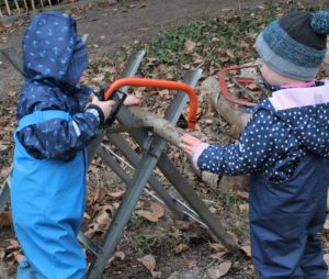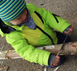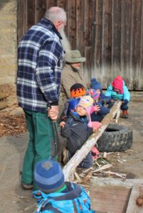 Am Montag, gleich nach dem Morgenkreis, beluden wir unseren Bollerwagen mit den Kinderrucksäcken, dem Händewaschwasser samt Seife und Handtüchern und, besonders wichtig, mit den Bügelsägen. Der Plan lautete: Wir wandern zu „unserem“ Wäldchen oberhalb der Quelle, um dort nach Brennholz zu suchen. Das hat uns der Bürgermeister persönlich erlaubt. Dort angekommen, haben wir erst mal ausgiebig gevespert. Dann suchten wir herumliegende Ästen, die wir zu Brennholz für den Ofen im Bauwagen kleinsägen können. Bald entdeckte jedes Kind solche Aststücke. Wenn sie nicht in den Bollerwagen passten, wurden sie eben kurzer Hand abgesägt. Das müssen wir freilich noch ein bisschen üben, denn wer kann schon mit 3 Jahren eine Bügelsäge perfekt bedienen? Aber wir üben gerne und wenn es etwas Sinnvolles ist umso lieber. Bald hatten wir einen übervollen Bollerwagen, also kamen die Rucksäcke auf die Rücken. Mit vereinten Kräften zogen und schoben wir unseren „Langholzlaster“ bis zum Pabst-Hof.