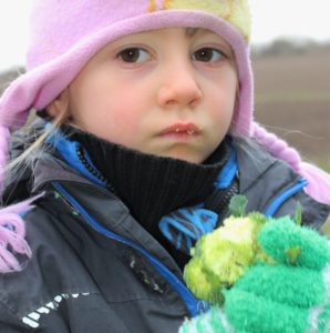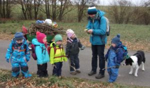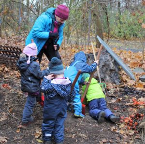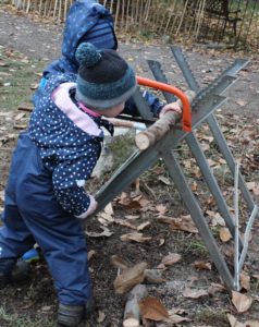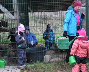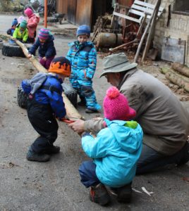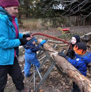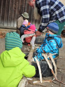 Alle Neune hatten wir am Dienstag gegen 9 Uhr im Morgenkreis beisammen. Sie saßen gut eingepackt auf den Holzklötzen im Morgenkreis. In der Mitte die Baumscheibe mit den Wochen-Männchen. Die stellte Enrico fast alle in die richtigen Tage, denn jedes Männchen mit seinem typischen Filzhütchen steht für einen Wochentag. Aila half dann noch ein bisschen. „Heute ist Dienstag, den ganzen Tag“, sangen wir und hüpften dazu im Kreis. „Der Himmel ist grau und keine Sonne zu sehen“, kommentierten einige Kinder das Wetter. Elke erzählte von den Aufgaben des Tages: Tiere versorgen, ein Loch graben und Holzsägen. Eine Gruppe kümmerte sich mit Elke um die Hühner: Das sieht inzwischen so aus, dass sich die vier Kinder im Hühnergehege auf eine kleine Bank setzen und das Futter in ihren Händen den Hühnern anbieten, in Kniehöhe. Damit kommen die kleinen Menschen und die kleinen Tier immer mehr in Kontakt. Das Ziel ist, das einzelne Hühner in ein paar Wochen bei den Kindern auf dem Schoß sitzen.