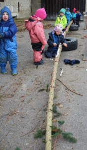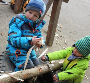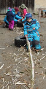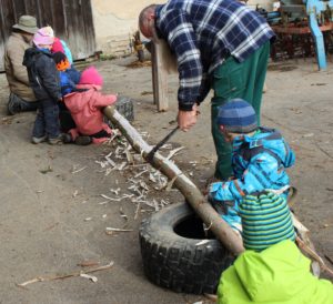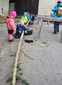 Zum Morgenkreis verkrochen wir uns am Mittwoch wegen des kalten Windes in den windgeschützten Steinkreis unter den Fichten. Und weil wir den Holzofen im Bauwagen immer gleich morgens einheizen, ist es dort nach dem Morgenkreis schön kuschelig warm zum Vespern. Außerdem gibt es hier warmen Tee. Die Ziegen bekamen heute die übrigen Brokkoli-Strünke von gestern, die sie mit Genuss verspeisten. Zum ersten Mal wanderten wir auf die Hofstelle nebenan, denn dort hatte der Bauer Uli und die Väter Sebastian Jungbluth und Florian Amann die 17 neun Meter langen Fichtenstämme, die sie am Samstag geschlagen hatten, abgelegt. Jetzt ist es unsere Aufgabe, sie zu schälen! Mit vier Zieheisen und zwei Handsägen wagten die Kinder die ersten Versuche. Noch etwas ungewohnt am Anfang, aber mit ein bisschen Übung schafften es einige Kinder schon, ein paar längere Rindenstreifen abzuziehen. Nach einer Stunde war die erste Stange geschält. Wozu wir die brauchen, wird jetzt noch nicht verraten, aber die Kinder wissen es natürlich! Danach hieß es: „Frischer geht’s nicht!“ Und wir probierten vom Brokkoli, vom Spinat, von der Kresse, dem Schnittlauch und vom Salat direkt aus dem Hochbeet, bzw. vom Acker. Wie unterschiedlich das alles schmeckt! Zeit zum freien Spielen blieb auch heute wieder, ob im Sand, in der Matschküche oder am Backofen.