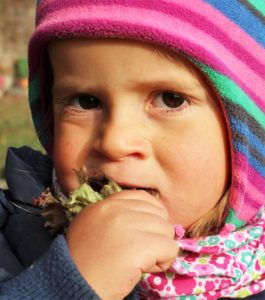 Heute kam Inge Pabst vorbei und lud ein paar Kinder ein, mit ihr vom Brokkoli zu ernten und ihn frisch zu kosten. Mit etwas Respekt versuchten alle das wirklich frische Gemüse und staunten nicht schlecht über den einmaligen Geschmack. „Das könnt ihr jeden Tag essen und es ist so gesund“, erklärte Inge beim Verabschieden. Ein Loch für das Lagern der Karotten begann Elke zu graben und manch eines der Kinder half fleißig mit, wenngleich der Boden sehr trocken, hart und voller Wurzeln ist. Emanuel schaute anfangs bei Helmut zu, wie der auf dem Sägebock Brennholzstücke für den Ofen im Bauwagen absägte. Mit einem Mal hielt er dann jedes Holzstück fest und kurz darauf beschloss er, die Aststücke alleine aus dem Bollerwagen zu holen – das nennen wir selbstwirksames Lernen durch Vorbilder.