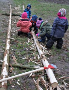 Am Donnerstag schälten wir nach dem Morgenkreis, der Brotzeit und dem Tiere versorgen erst mal eine weitere Fichtenstange für unser Tipi. Das ist jetzt die vierte von 17. Die Kinder halfen fleißig mit, konnten doch inzwischen alle den Umgang mit den Zieheisen auf den Ziehbänken etwas einüben. Hanna überbot alle mit ihrer großen Ausdauer.