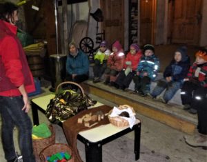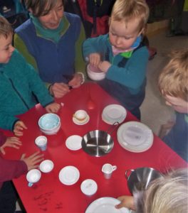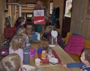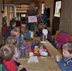 Und die erklärte Elke gegen 9.00 Uhr in der großen Scheune. Die Kinder lauschten und konnten gleich bei den Liedern, der Monatskette und den drei Regeln mit einsteigen.