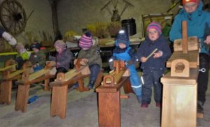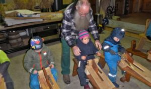 Auf den 5 hauseigenen Kinderziehbänken, einer weiteren mitgebrachten Ziehbank für Kinder und einer Erwachsenenziehbank lud Helmut zum Probesitzen ein. Mit diesem uralten Wunderwerk aus dem 9. Jahrhundert hat früher jeder holzbearbeitende Handwerker gearbeitet. Mit einer Ziehbank lassen sich fast alle Arbeiten rund ums Holz erledigen, z.B. schälen, schnitzen, sägen, bohren usw.