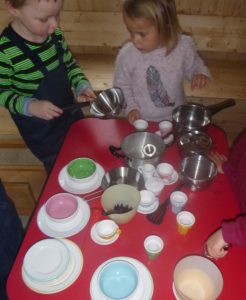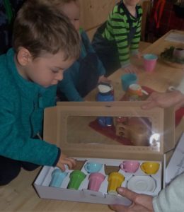 Mit großer Freude und Begeisterung durften die Kinder einige verspätete Weihnachtsgeschenke ausgepacken. Heraus kamen Porzellangeschirr, Töpfe und andere Kochutensilien. Die passen gut in die kleine Kinderküche im Bauwagen.