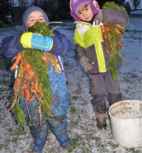 Ausgerüstet mit einer Grabgabel ging‘s zum Gemüsefeld. Interessanterweise ließen sich heute die Möhren viel leichter ausgraben als bisher. Klar: Die Erde war vom Regen gut durchfeuchtet und deshalb sehr locker. So konnten wir auch die ganz langen Möhren ausgraben, ohne dass sie abbrachen.