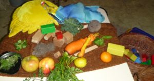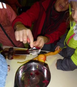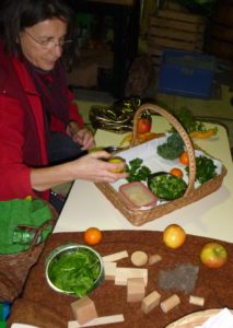 Inge zeigte uns anschaulich, wie in der Erde verschiedene Bausteine durch Regen und Sonne sich im Gemüse zu anderen Bausteinen verwandeln, die wir unbedingt brauchen, um zu wachsen und gesund zu bleiben.