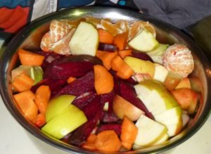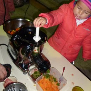 Nun schnippelten wir das Obst und das Gemüse klein. Nachdem der Entsafter zusammengebaut war, konnten wir die Gemüsestückchen endlich pressen lassen.