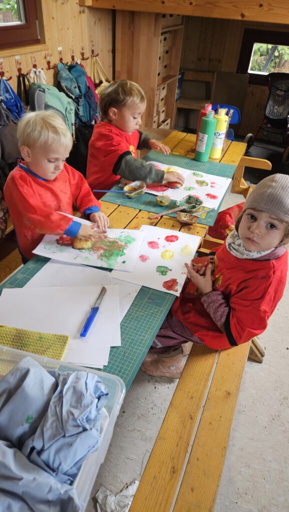 Auch im kreativen Bereich hat uns der Apfel begleitet und sowohl als buntes Fensterbild als auch in Form von Apfeldruck-Bildern unseren Bauwagen verschönert.