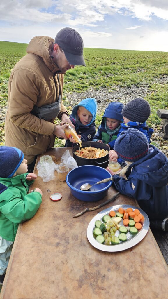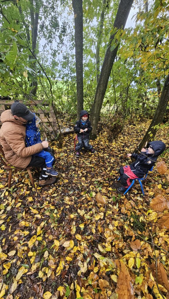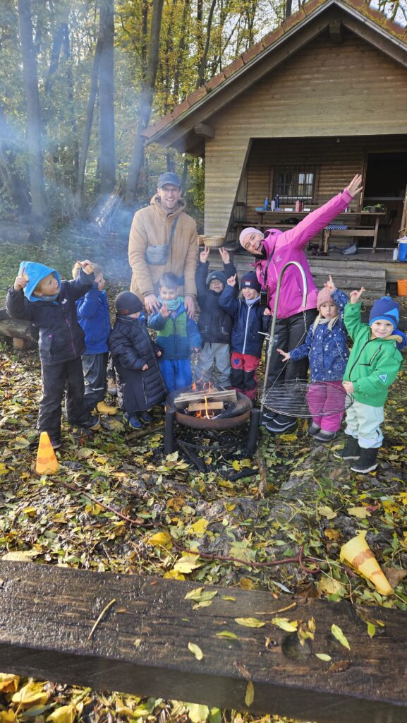 Besonders faszinierend fanden die Kinder, dass sich Fuchs und Dachs tatsächlich einen Bau teilen und dass ein Waldkauz durch ein samtiges Polster auf den Flügeln nahezu geräuschlos durch den nächtlichen Wald fliegen kann. Im Wald finden unsere Großen genügend Stöcke, um eifrig für den begehrten Schnitz-Führerschein zu üben. Alle sind sich einig: Schmor-Äpfel, auf dem Lagerfeuer gegart, schmecken besonders köstlich!